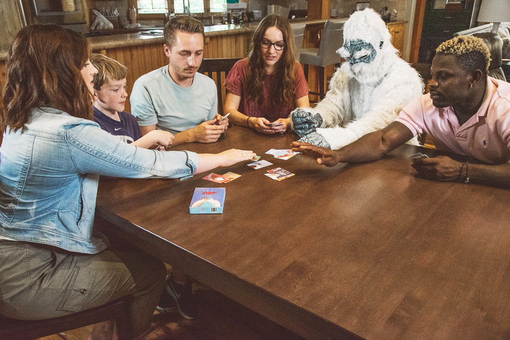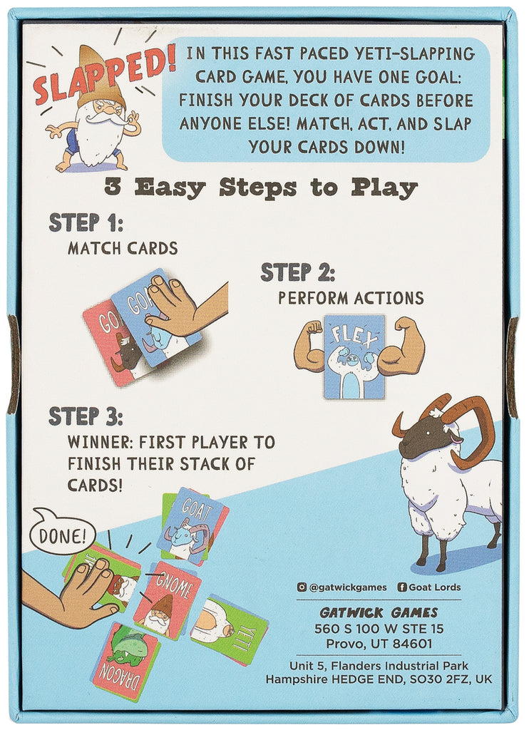 Yeti Slap is a speed card game where players try to get rid of their cards the fastest. Players slap down cards on top of matches, but if an action comes up, players must be the fastest to do the action and then can slap down another card. Cards have different colors to throw you off, so you'll need to hone in your best focus skills to win. Learn in 5 minutes, play for years!